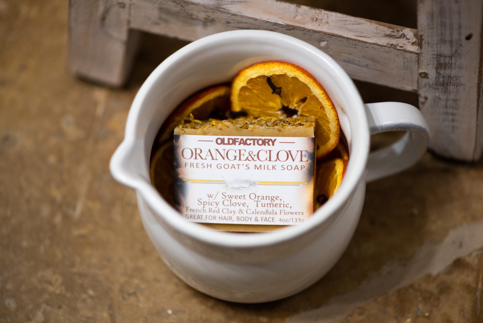 Ingredients: Saponified organic olive oil, organic coconut oil, organic flaxseed oil, organic shea butter, fresh goats milk, essential oils of orange and clove, organic turmeric and organic calendula petals.