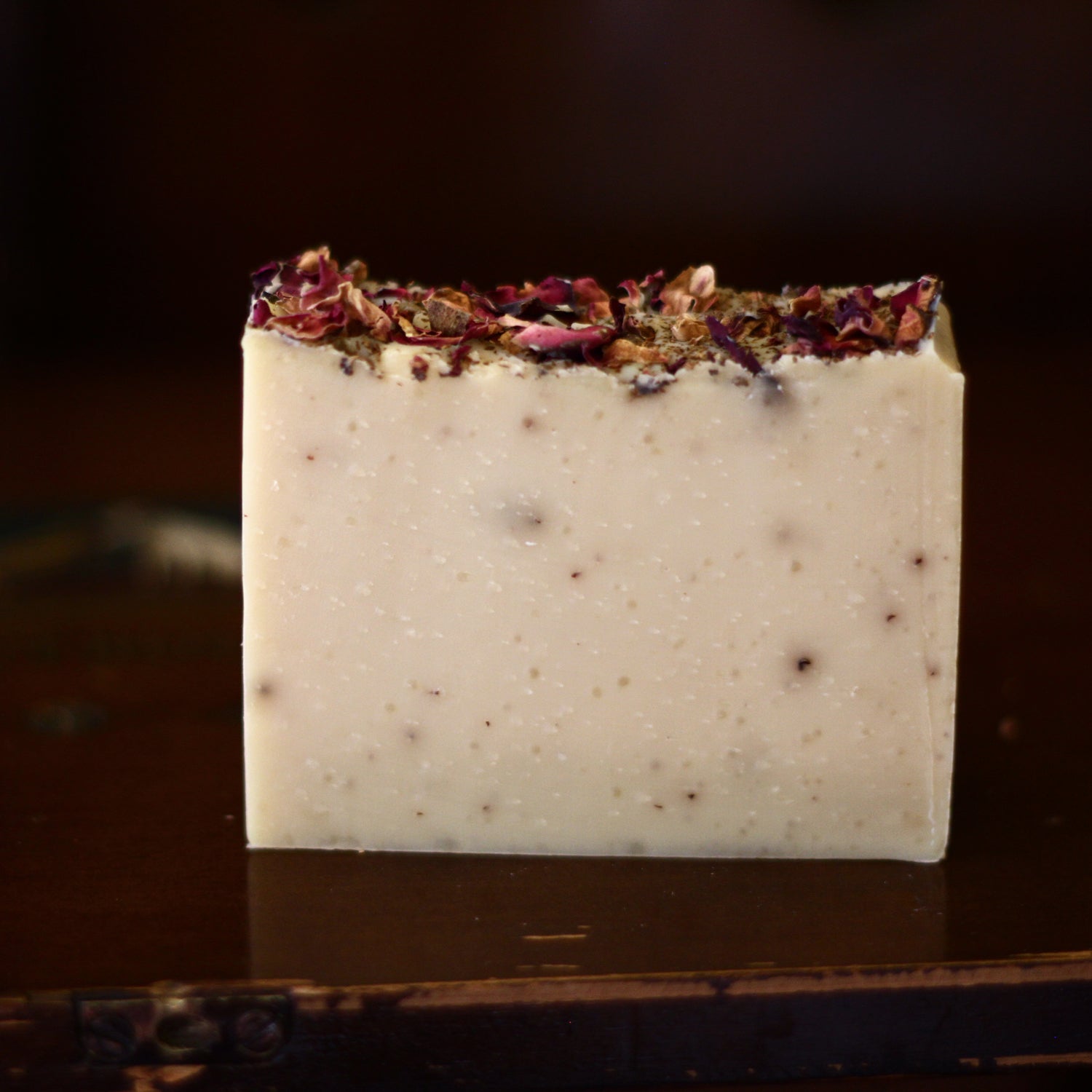 Ingredients: Saponified organic olive oil, organic coconut oil, organic flaxseed oil, raw organic shea butter, essential oils, fragrance (this is the only bar that contains a TINY amount of HIGH QUALITY synthetic fragrance), rose petals.