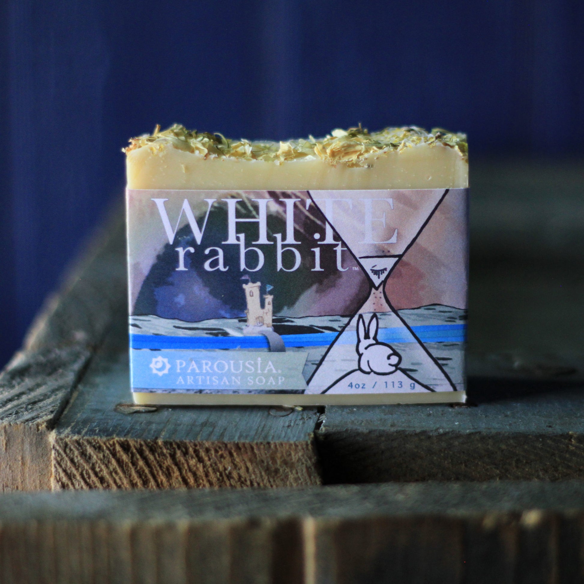 White Rabbit Artisan Soap is made of 19 pure essential oils It’s voice of tuberose is backed up by notes of lavender and vanilla balanced with orange and held down by a base of cypriol. There is a little white clay (moon powder) mixed in for color and it’s topped off with crushed jasmine flowers.